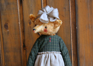 Мишка Дуня. По-моему, прям девочка девочка и такая Дуня...! ))) Сшита из очень старенького (но очень прочного) советского плюша, наполнена опилками и стеклянным гранулятом. Мишка старенькая, один глазик потерян. 6 шплинтов (головушка на двойном - качается). Платье-пальто сшито из фетра (подкладка хб), косыночка хб и украшена старой булавкой. Все, включая чулки, снимается. Сама не стоит, поэтому сидя 18 см. Единственный и неповторимый экземпляр.