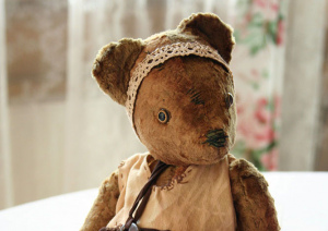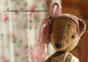 Мишка Ниночка. Сшита из антикварного плюша. Наполнена опилками. Головушка на двойном шплинты (качается). Платье - винтажные ткани, пуговички и кружево, на груди старенький ключик. Платье снимается. Единственный экземпляр.
