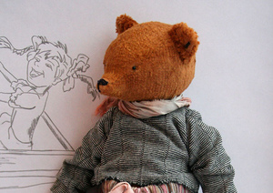 Мишка Талула. Сшита из плюша ручного окраса. Набита древесными опилками и металлическим гранулятом. 6 шплинтов (головушка на двойном - качается). Ножки и ручки кукольные (середина прошлого века). Одежда - х/б ткани, состарены кофе и чаем. пуговицы винтажные. В кармашке игрушка из паперклея. Единственный экземпляр.